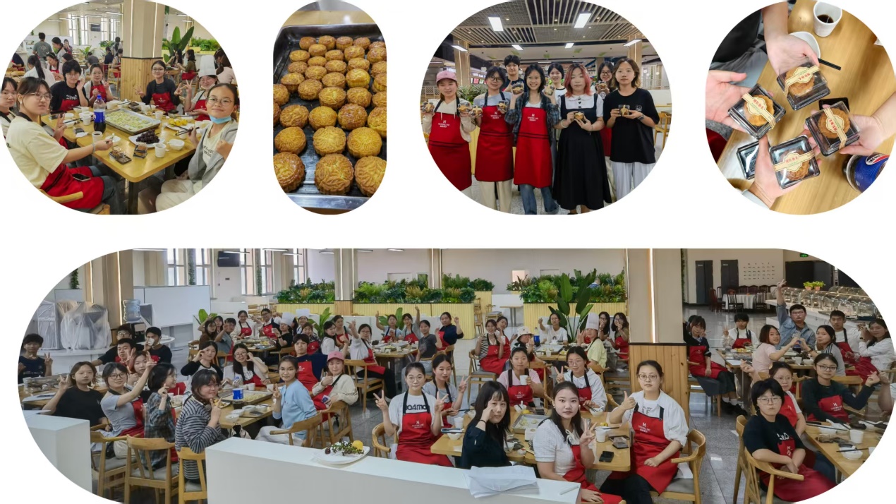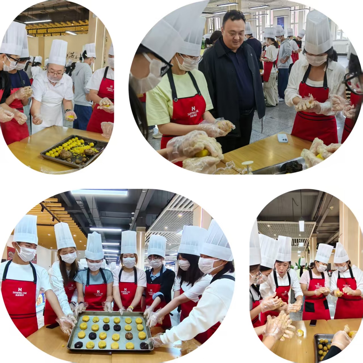 活动现场,热烈欢快。胜和餐饮的师傅们早早准备好面粉、馅料、模具等食材和工具,各色月饼馅料整齐摆放。同学们早早来到现场,穿围裙、戴手套,跃跃欲试地围在操作台前。实践操作环节,食堂面点师傅细致讲解、耐心示范了月饼制作的全过程。同学们纷纷撸起袖子,揉面、包馅、压模……有的同学初次尝试包月饼,一步一步的制作,不一会,餐盘里就摆满了月饼。在月饼烤制的过程中,大家开始包饺子,同学们互相交流着家乡的包法,创意十足,元宝形、月牙形的饺子摆满了托盘,虽形态不一,却都饱含着浓浓的祝福与情谊。